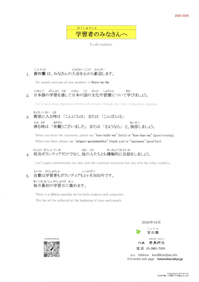 (ひらがな・カタカナを読めない人・書けない人の為のクラスはありません。JLPT・N3レベル以上)